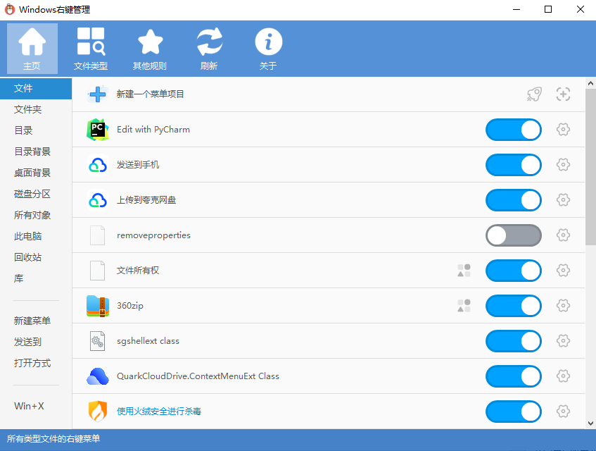 这个软件可以修改多个位置的右键菜单,添加或删除各个类型的菜单项目。