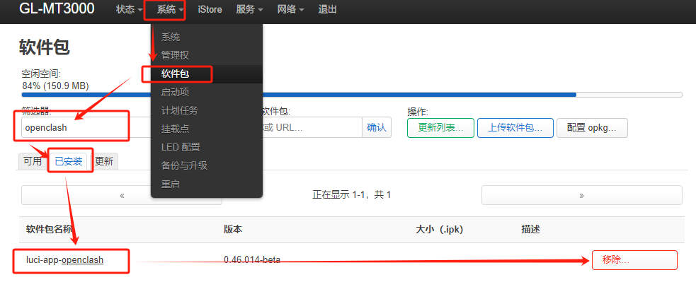 系统-----软件包----输入“插件名称”筛选-点击“移除”就可以了
