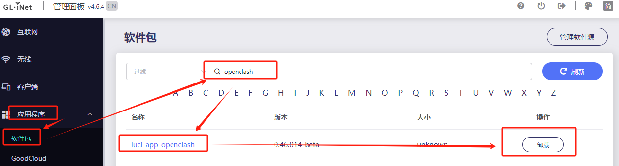 然后如果你发现找不到安装后的openclash,刷新页面也没有,那么重启路由吧。