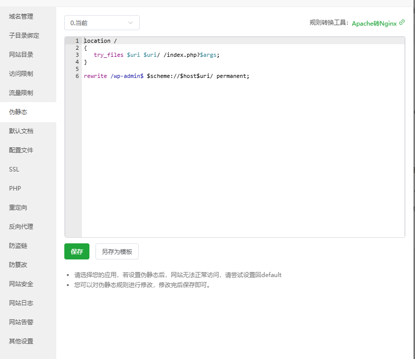 如果调整后出现文章页显示404,那么去宝塔面板的“网站”中选择对应“网站名”后的设置,进入后“伪静态”选择WordPress。