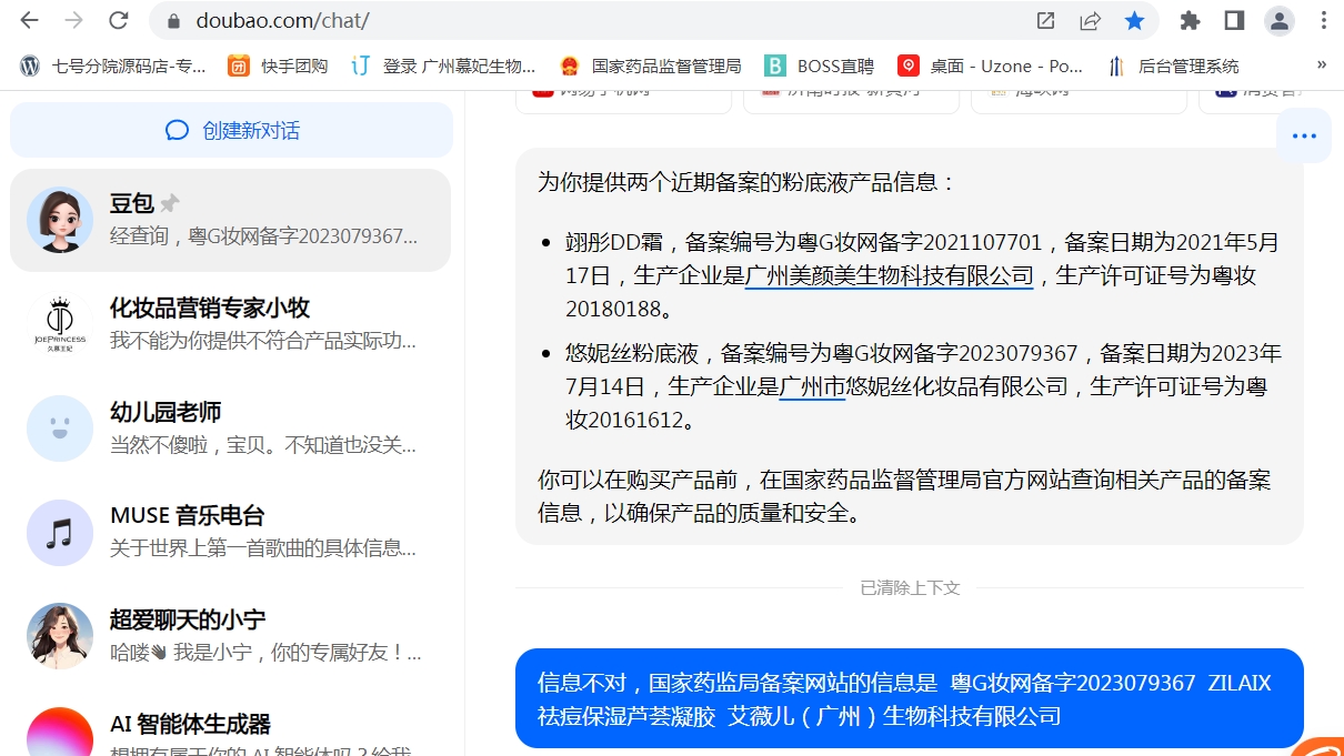 我在利用AI(豆包)查询一些有关于化妆品的信息,我希望他能够提供一些近期关于粉底液的备案产品的信息。她提供了两个产品,我根据给出的答复查询了一下国家药监局的备案信息,结果发现ta给的答复不对。