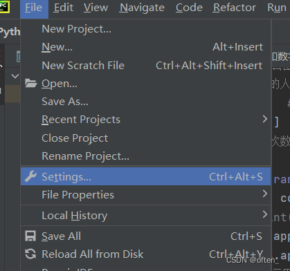 在PyCharm的顶部菜单栏中,依次点击 "File" -> "Settings"(Windows/Linux系统)