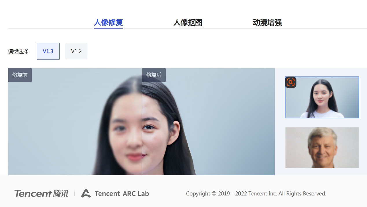 现在位置: 首页 / 科技 / 正文 腾讯ARC图片工具 塔林 科技 2024-04-25 2热度 0评论 腾讯ARC地址: https://arc.tencent.com/zh/ai-demos/faceRestoration Ta是做这些的 我试一下,他和百度的图片清晰度增强的效果差不多,是不能修复缺损的。